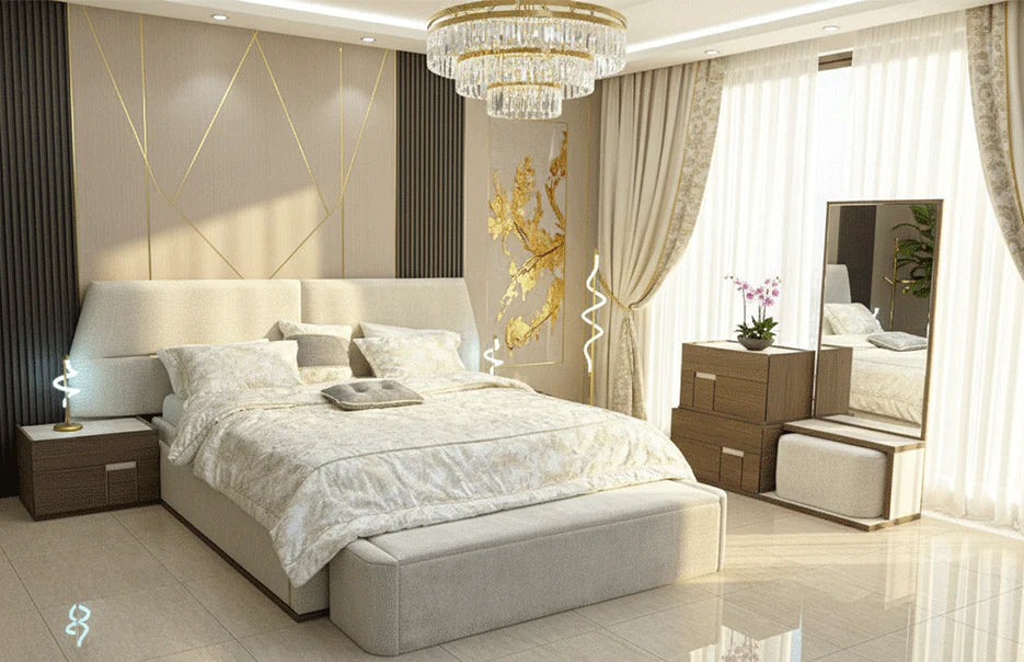 Hydraulic Bed + 2 Nightstands + Bed bench + Wardrobe + Dresser With Mirror + Drawer